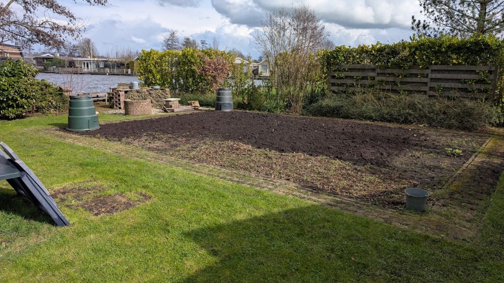 Afgelopen zaterdag en vandaag leuk in de tuin bezig geweest. We hebben twee grote gaten gegraven en hier ca. 4 kuub snoeiafval ingegraven. Snoeiafval was in het najaar ontstaan toen we vele bomen en struiken hadden gesnoeid. De moestuin ligt qua maaiveld nu ca. 10 centimeter hoger.